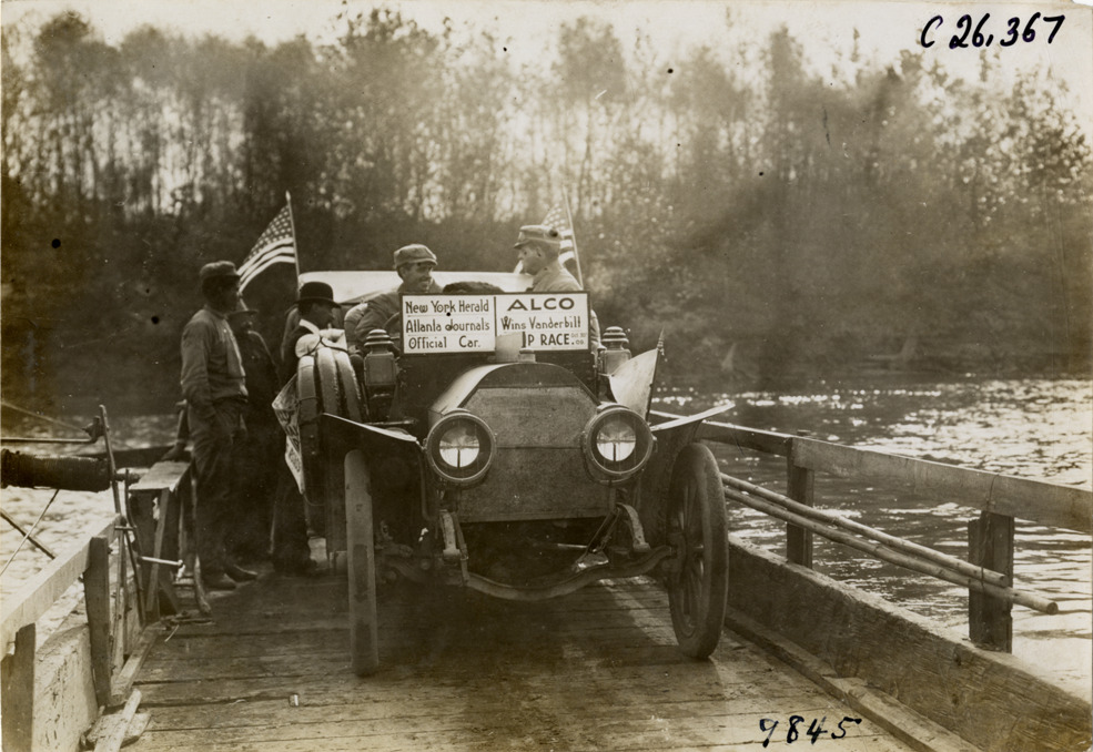 View of motorists in Alco official car on flatboat, crossing river, during the 1909 New York to Atlanta Good Roads Tour. Sign on car reads: "New York Herald, Atlanta Journal's official car, Alco wins Vanderbilt Cup Race, Oct. 30th '09." Stamped on back: "Photo by N. Lazarnick. 244-6-8 W. 42nd Street, N.Y. Tel. 594 Bryant. In ordering duplicates mention number on back of this print." Handwritten on back: "Tours--New York-Atlanta Good Roads Tour, 1909."