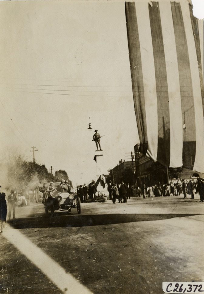 View of motorists in car passing soldiers' monument during the 1909 New York to Atlanta Good Roads Tour. Large American flag is partially visible in foreground. Stamped on back: "Photo by N. Lazarnick. 244-6-8 W. 42nd Street, N.Y. Tel. 594 Bryant. In ordering duplicates mention number on back of this print." Handwritten on back: "Tours--New York-Atlanta Good Roads Tour, 1909."