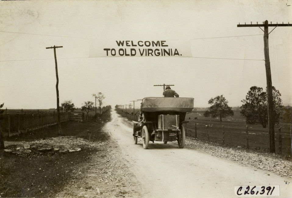 Rear view of car passing under "Welcome to Old Virginia" banner during the 1909 New York to Atlanta Good Roads Tour. Stamped on back: "Photo by N. Lazarnick. 244-6-8 W. 42nd Street, N.Y. Tel. 594 Bryant. In ordering duplicates mention number on back of this print." Handwritten on back: "Tours--New York-Atlanta Good Roads Tour, 1909."