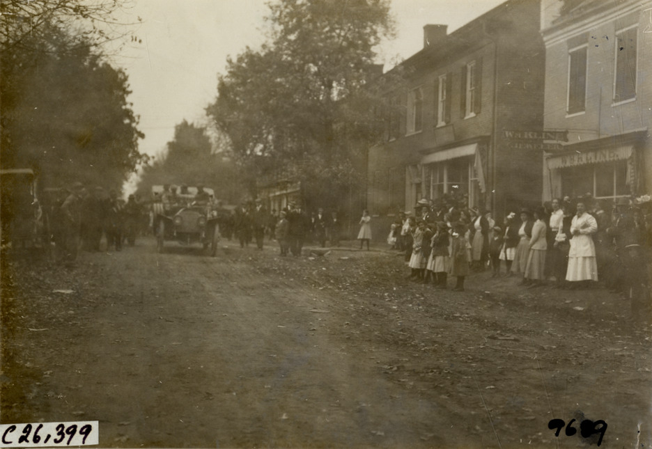 View of motorists in car passing group of spectators during the 1909 New York to Atlanta Good Roads Tour. Commercial buildings in background. Stamped on back: "Photo by N. Lazarnick. 244-6-8 W. 42nd Street, N.Y. Tel. 594 Bryant. In ordering duplicates mention number on back of this print." Handwritten on back: "Tours--New York-Atlanta Good Roads Tour, 1909."
