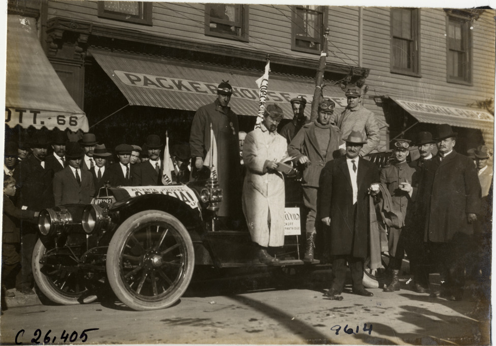 View of motorists posing with Stearns official car at Perth Amboy, New Jersey during the 1909 New York to Atlanta Good Roads Tour. Packer House Cafe in background. Stamped on back: "Photo by N. Lazarnick. 244-6-8 W. 42nd Street, N.Y. Tel. 594 Bryant. In ordering duplicates mention number on back of this print." Handwritten on back: "Tours--New York-Atlanta Good Roads Tour, 1909."