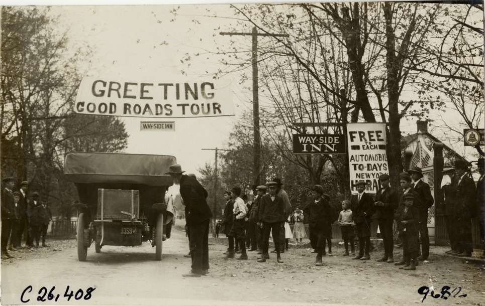 Rear view of car stopping under "Greeting Good Roads Tour" banner in front of Way-Side Inn during the 1909 New York to Atlanta Good Roads Tour. Spectators stand on roadside near "Way-Side Inn" and "Free to each automobile, to-days New York Herald" signs. Stamped on back: "Photo by N. Lazarnick. 244-6-8 W. 42nd Street, N.Y. Tel. 594 Bryant. In ordering duplicates mention number on back of this print." Handwritten on back: "Tours--New York-Atlanta Good Roads Tour, 1909."