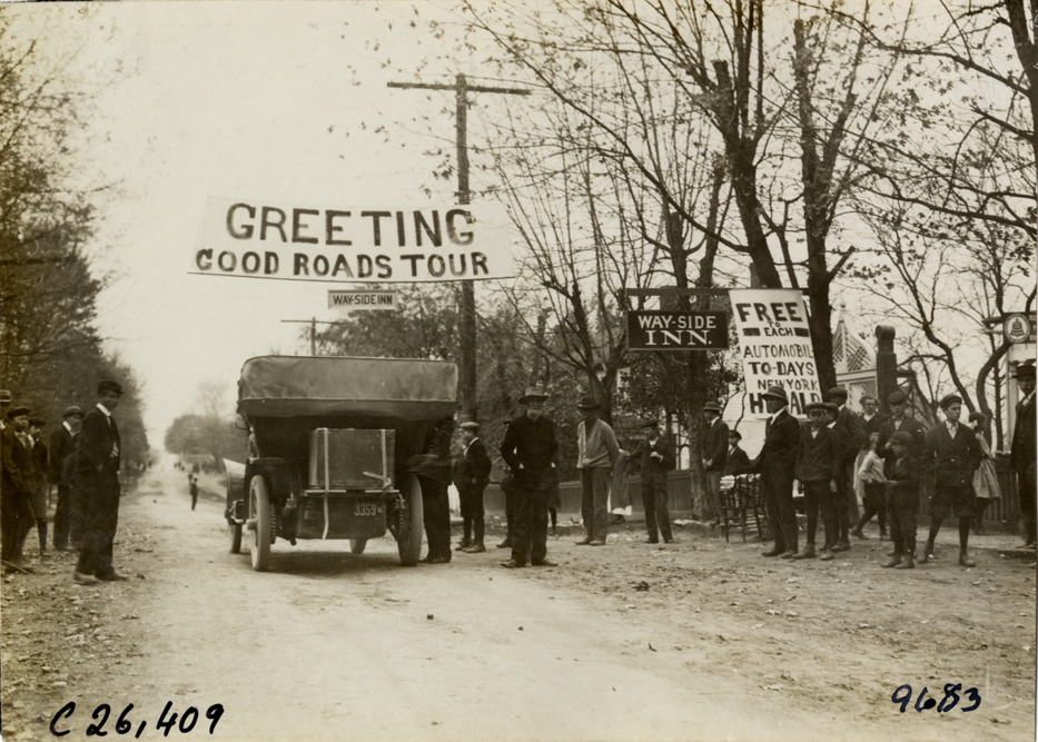 Rear view of car stopping under "Greeting Good Roads Tour" banner in front of Way-Side Inn during the 1909 New York to Atlanta Good Roads Tour. Spectators stand on roadside near "Way-Side Inn" and "Free to each automobile, to-days New York Herald" signs. Stamped on back: "Photo by N. Lazarnick. 244-6-8 W. 42nd Street, N.Y. Tel. 594 Bryant. In ordering duplicates mention number on back of this print." Handwritten on back: "Tours--New York-Atlanta Good Roads Tour, 1909."