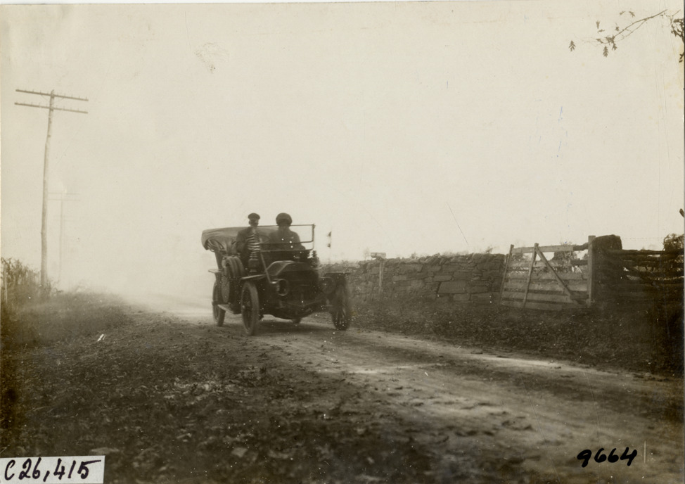 View of motorists in car traveling on rural dirt road during the 1909 New York to Atlanta Good Roads Tour. Gate in background. Stamped on back: "Photo by N. Lazarnick. 244-6-8 W. 42nd Street, N.Y. Tel. 594 Bryant. In ordering duplicates mention number on back of this print." Handwritten on back: "Tours--New York-Atlanta Good Roads Tour, 1909."
