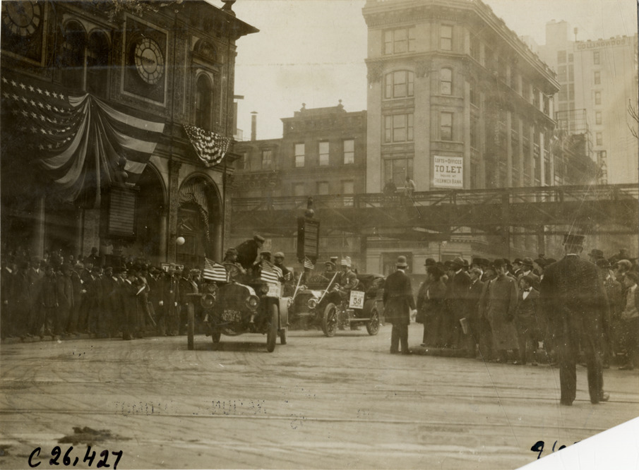 Motorists in automobiles passing New York Herald Building, 1909 New York-Atlanta Good Roads Tour