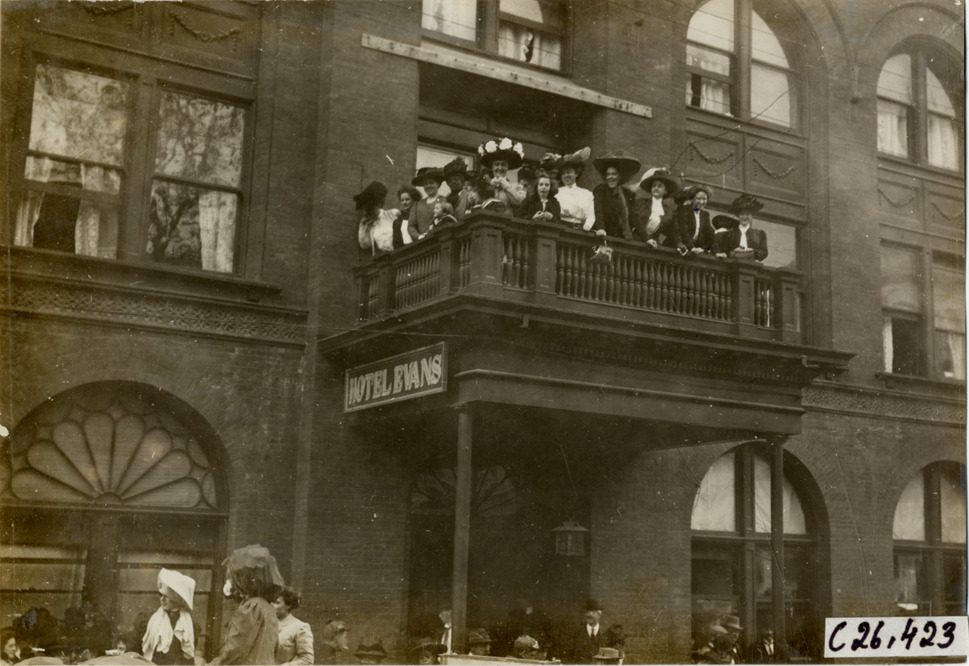 View of women and children on balcony of Hotel Evans at Winchester, Virginia during the 1909 New York to Atlanta Good Roads Tour. Stamped on back: "Photo by N. Lazarnick. 244-6-8 W. 42nd Street, N.Y. Tel. 594 Bryant. In ordering duplicates mention number on back of this print." Handwritten on back: "Tours--New York-Atlanta Good Roads Tour, 1909."