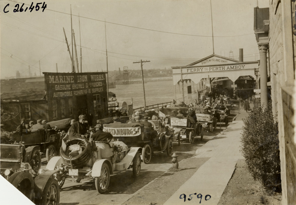View of motorists with cars lined up in front of ferry entrance at Tottenville, Staten Island, New York during the 1909 New York to Atlanta Good Roads Tour. Marine Iron Works on left; "Staten Island R'way, Ferry to Perth Amboy" is painted on wooden-frame building. Stamped on back: "Photo by N. Lazarnick. 244-6-8 W. 42nd Street, N.Y. Tel. 594 Bryant. In ordering duplicates mention number on back of this print." Handwritten on back: "Tours--New York-Atlanta Good Roads Tour, 1909."