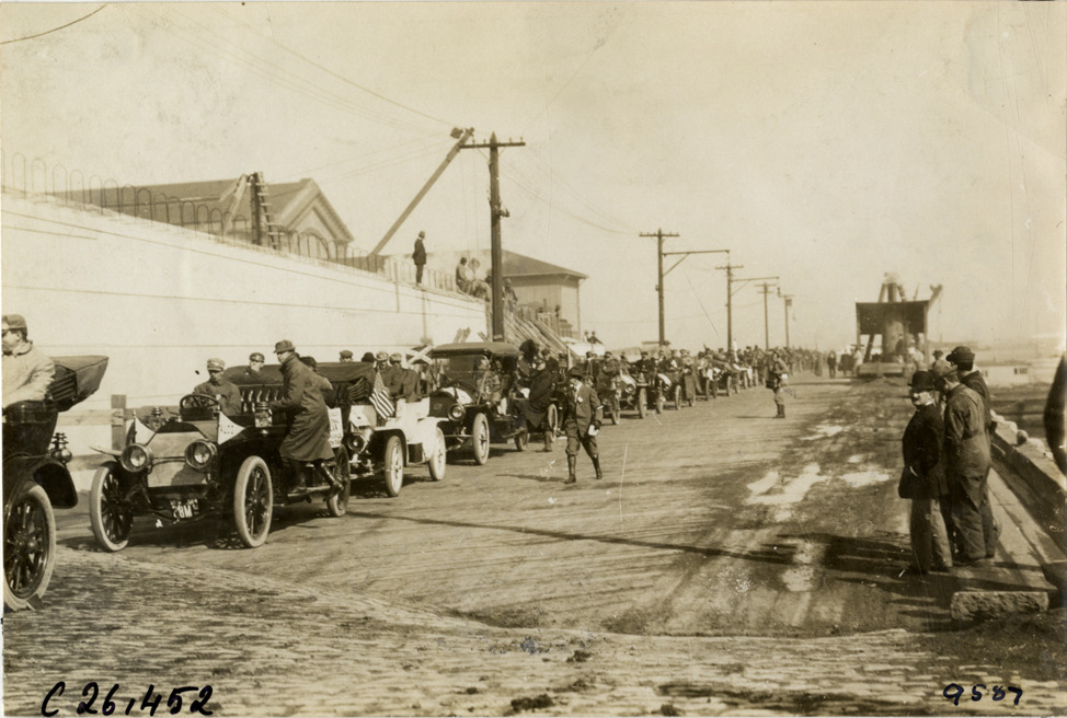 View of motorists in cars lined up next to wall waiting for the Staten Island ferry during the 1909 New York to Atlanta Good Roads Tour. Stamped on back: "Photo by N. Lazarnick. 244-6-8 W. 42nd Street, N.Y. Tel. 594 Bryant. In ordering duplicates mention number on back of this print." Handwritten on back: "Tours--New York-Atlanta Good Roads Tour, 1909."