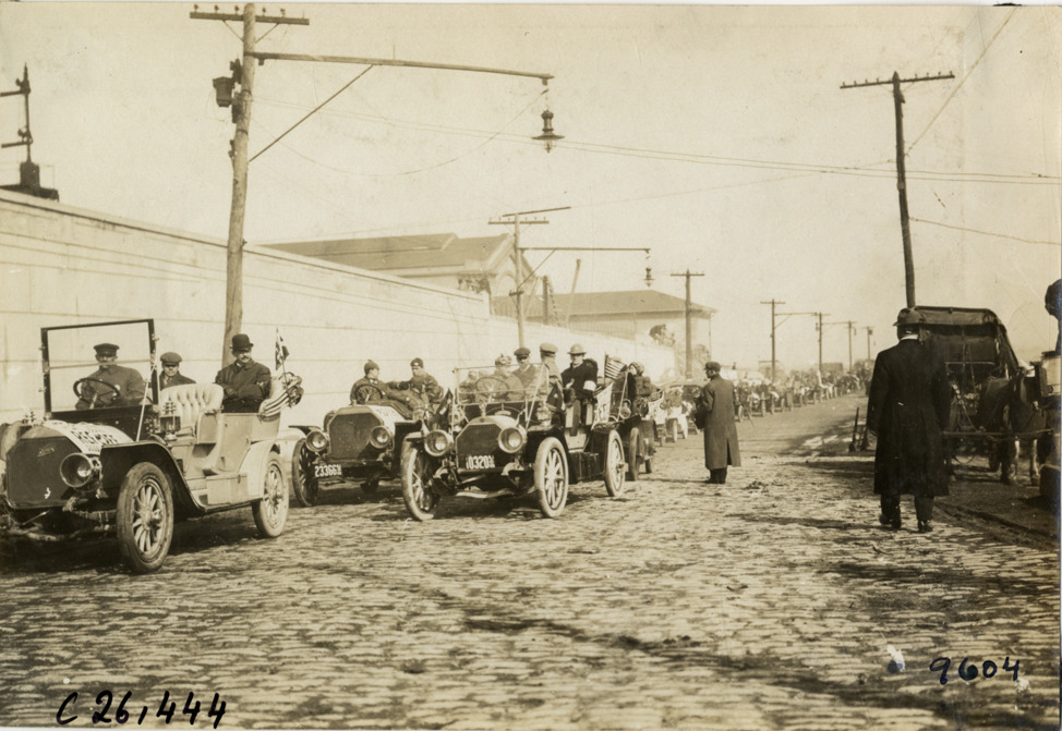 Automobiles waiting for Staten Island ferry, 1909 New York-Atlanta Good Roads Tour