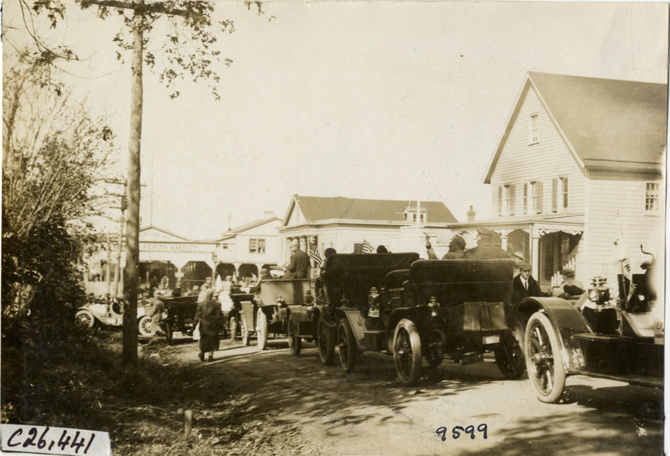 Automobiles in front of ferry entrance at Tottenville, Staten Island, 1909 New York-Atlanta Good Roads Tour