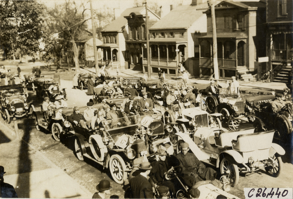 View of motorists with cars lined up in street during the 1909 New York to Atlanta Good Roads Tour. Wooden-frame houses in background. Stamped on back: "Photo by N. Lazarnick. 244-6-8 W. 42nd Street, N.Y. Tel. 594 Bryant. In ordering duplicates mention number on back of this print." Handwritten on back: "Tours--New York-Atlanta Good Roads Tour, 1909."
