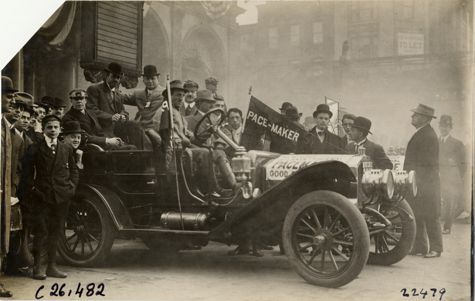 View of motorists posing with Mitchell pacemaker car in front of the New York Herald Building during the 1909 New York to Atlanta Good Roads Tour. Spectators in background. Stamped on back: "Photo by N. Lazarnick. 244-6-8 W. 42nd Street, N.Y. Tel. 594 Bryant. In ordering duplicates mention number on back of this print." Handwritten on back: "Tours--New York-Atlanta Good Roads Tour, 1909."