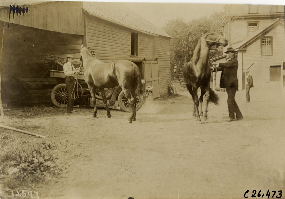 View of men leading two horses during the 1909 New York to Atlanta Good Roads Tour. Car, barn and wooden-frame house in background. Handwritten on back: "Tours--New York-Atlanta Good Roads Tour, 1909."