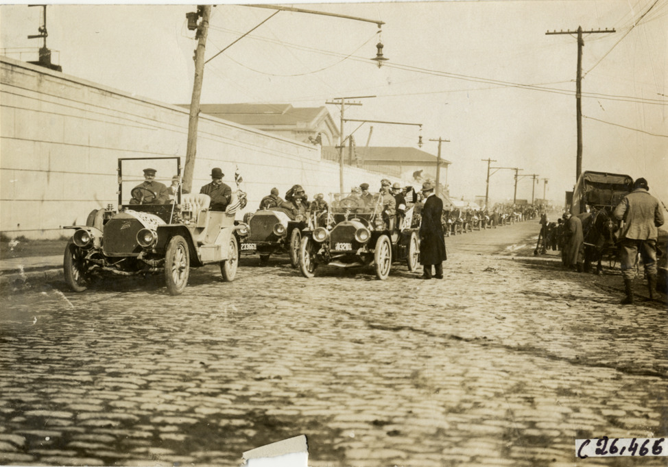 Automobiles waiting for Staten Island ferry, 1909 New York-Atlanta Good Roads Tour