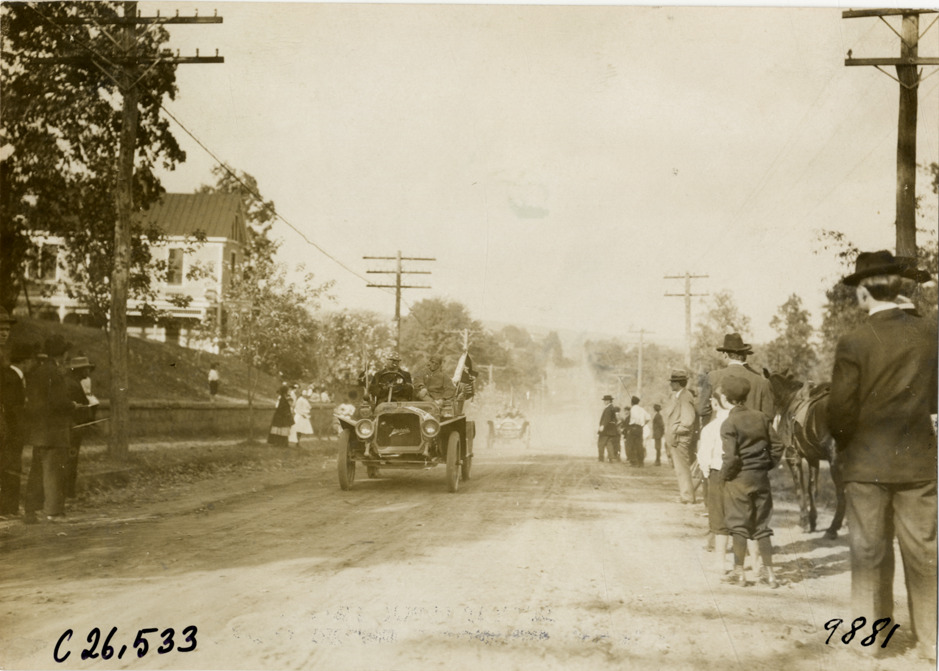 View of Frank X. Zirbies and passengers in Mitchell pacemaker car passing spectators on roadside during the 1909 New York to Atlanta Good Roads Tour. Handwritten on back: "Tours--New York-Atlanta Good Roads Tour, 1909."