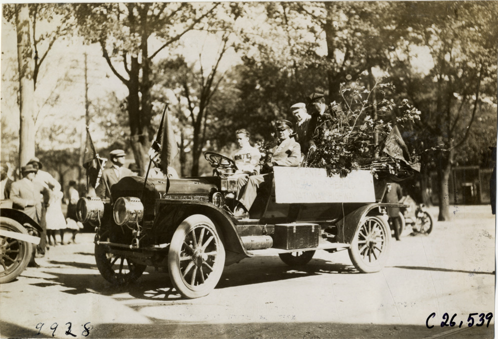 View of motorists posing in White Steamer during the 1909 New York to Atlanta Good Roads Tour. Car is decorated with tree branches. Stamped on back: "Photo by N. Lazarnick. 244-6-8 W. 42nd Street, N.Y. Tel. 594 Bryant. In ordering duplicates mention number on back of this print." Handwritten on back: "Tours--New York-Atlanta Good Roads Tour, 1909."