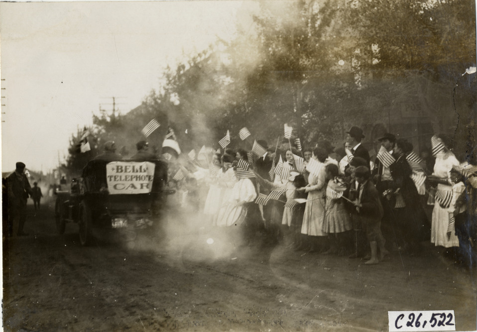 View of spectators waving small American flags at car during the 1909 New York to Atlanta Good Roads Tour. "Bell Telephone car" sign is displayed on back of automobile. Stamped on back: "Photo by N. Lazarnick. 244-6-8 W. 42nd Street, N.Y. Tel. 594 Bryant. In ordering duplicates mention number on back of this print." Handwritten on back: "Tours--New York-Atlanta Good Roads Tour, 1909."