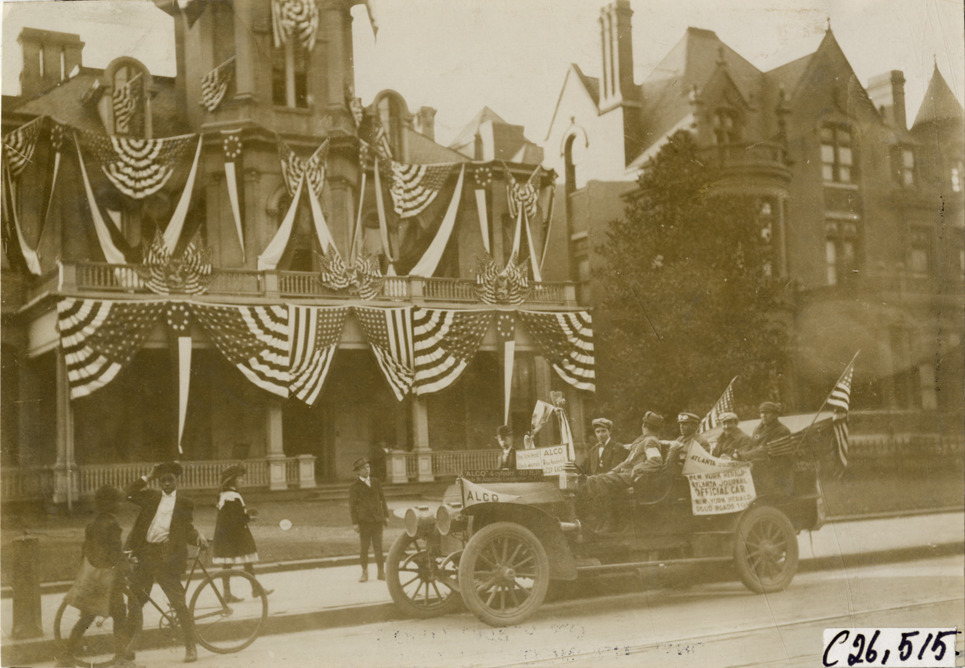 View of motorists posing in Alco official car in front of house decorated with bunting during the 1909 New York to Atlanta Good Roads Tour. Boys with bicycle in foreground; Chateauesque style house in background. Stamped on back: "Photo by N. Lazarnick. 244-6-8 W. 42nd Street, N.Y. Tel. 594 Bryant. In ordering duplicates mention number on back of this print." Handwritten on back: "Alco official car. Tours--New York-Atlanta Good Roads Tour, 1909."