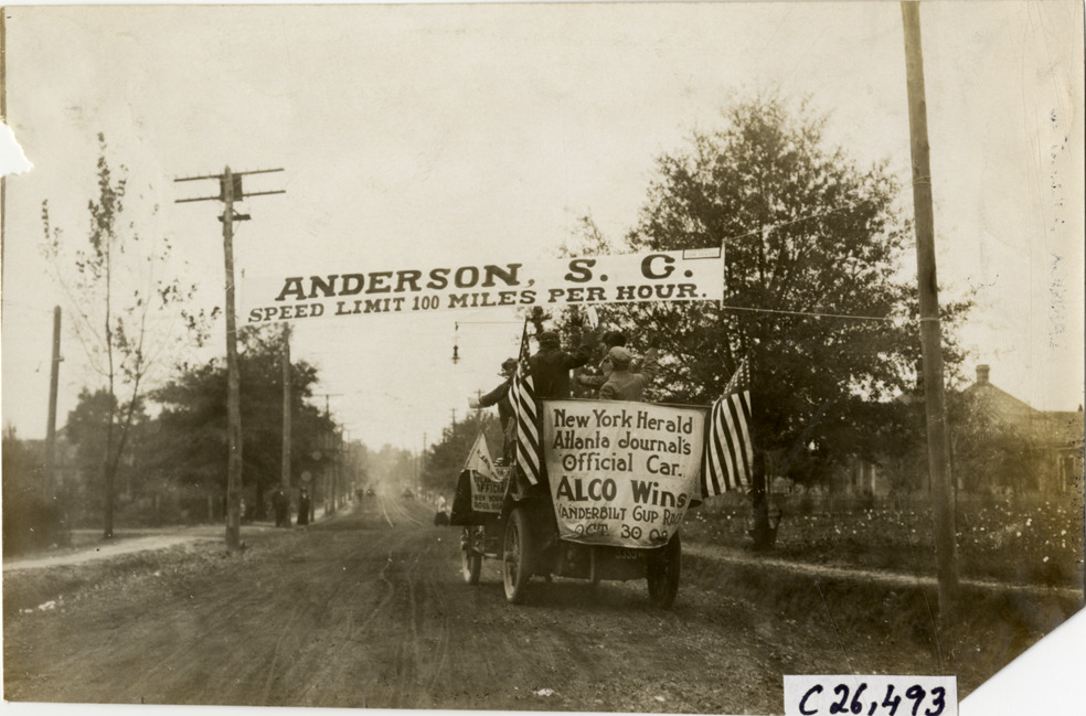 Rear view of Alco official car approaching banner over road at Anderson, South Carolina during the 1909 New York to Atlanta Good Roads Tour. Banner reads: "Anderson, S.C. Speed limit 100 miles per hour." Sign on back of car reads: "New York Herald Atlanta Journal's official car. Alco wins Vanderbilt Cup Race, Oct. 30, '09." Handwritten on back: "Tours--New York-Atlanta Good Roads Tour, 1909."