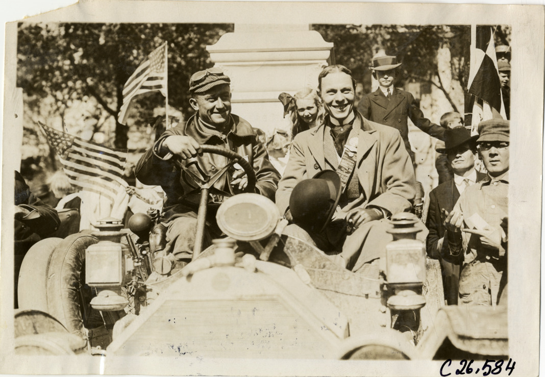 View of Ty Cobb and Atlanta mayor Robert F. Maddox posing in Chalmers-Detroit car during the 1909 New York to Atlanta Good Roads Tour. Stamped on back: "Spooner & Wells, Inc., photographers, telephones 3472-3473 Columbus, 1931 Broadway, New York." Handwritten on back: "Mayor Maddox (in car, right). Tours--New York-Atlanta Good Roads Tour, 1909."