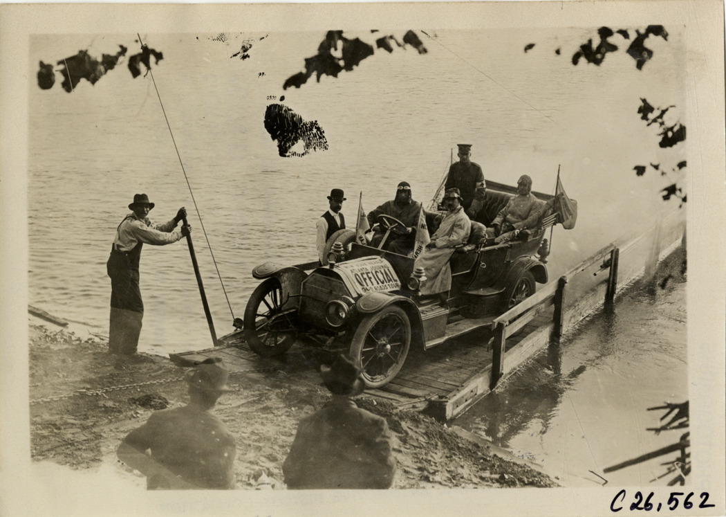 View of motorists in official car on flatboat next to shore during the 1909 New York to Atlanta Good Roads Tour. Stamped on back: "Photo by Spooner & Wells, Inc. 1931 Broadway, N.Y." Handwritten on back: "Tours--New York-Atlanta Good Roads Tour, 1909."