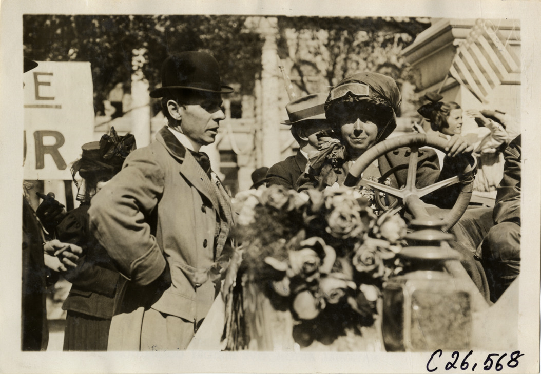 Joan Cuneo in Rainier press automobile at Decatur, Georgia, 1909 New York-Atlanta Good Roads Tour