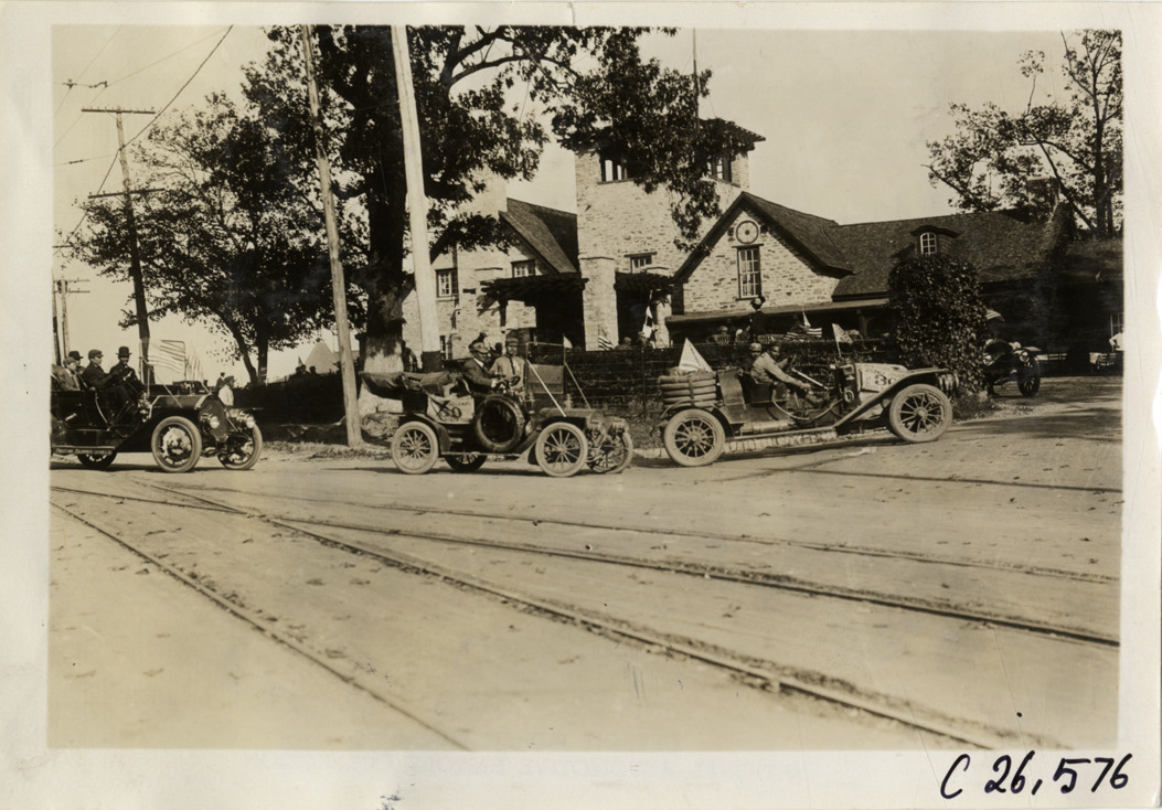 View of motorists in cars in front of the Piedmont Driving Club during the 1909 New York to Atlanta Good Roads Tour. Stamped on back: "Spooner & Wells, Inc., photographers, telephones 3472-3473 Columbus, 1931 Broadway, New York." Handwritten on back: "Piedmont Driving Club. Tours--New York-Atlanta Good Roads Tour, 1909."