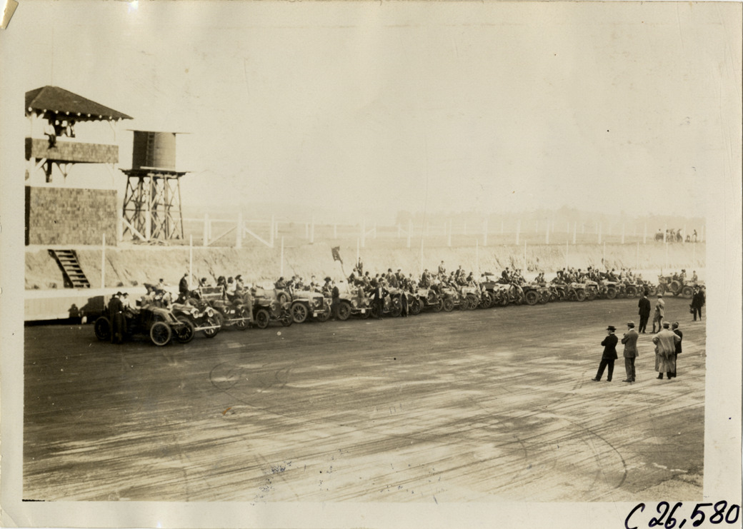 Distant view of cars lined up on track at Atlanta Speedway in Georgia during the 1909 New York to Atlanta Good Roads Tour. Water tower and press stand in background. Stamped on back: "Spooner & Wells, Inc., photographers, telephones 3472-3473 Columbus, 1931 Broadway, New York." Handwritten on back: "Tours--New York-Atlanta Good Roads Tour, 1909."