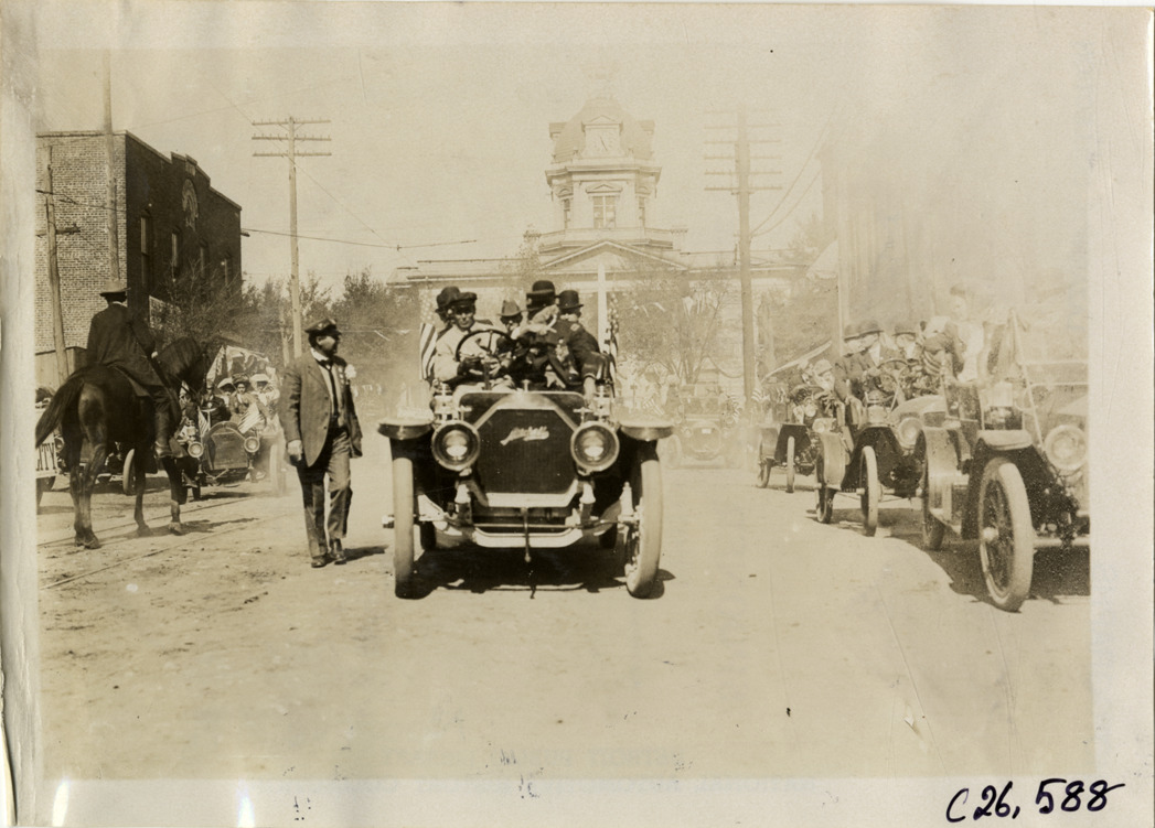 View of motorists in Mitchell pacemaker car at Decatur, Georgia during the 1909 New York to Atlanta Good Roads Tour. Man rides horse; cars are parked in street. DeKalb County Courthouse in background. Stamped on back: "Spooner & Wells, Inc., photographers, telephones 3472-3473 Columbus, 1931 Broadway, New York." Handwritten on back: "Tours--New York-Atlanta Good Roads Tour, 1909."