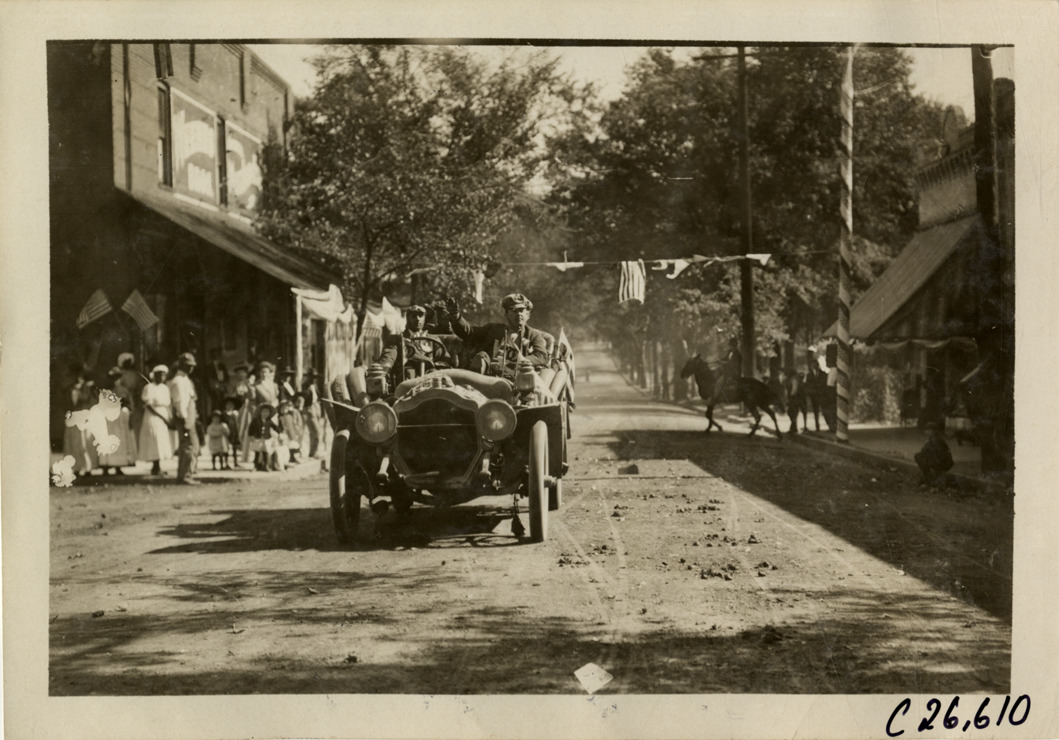 View of motorists in car at Decatur, Georgia during the 1909 New York to Atlanta Good Roads Tour. Spectators and commercial buildings in background. Stamped on back: "Photo by Spooner & Wells, Inc. 1931 Broadway, N.Y." Handwritten on back: "Tours--New York-Atlanta Good Roads Tour, 1909."