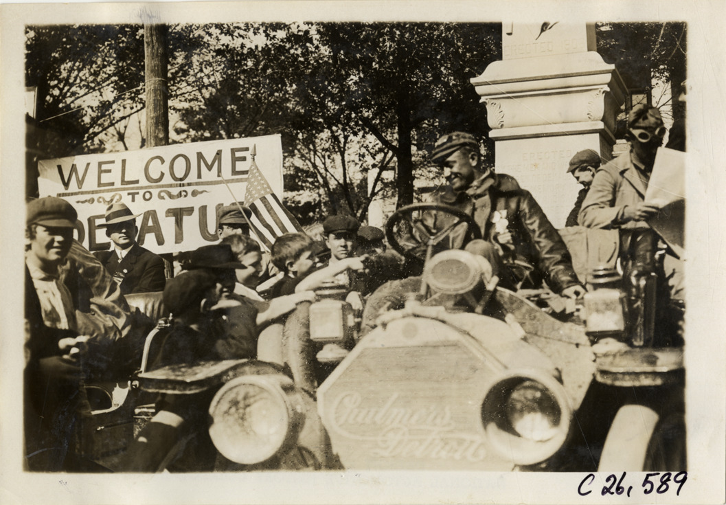View of Ty Cobb in Chalmers-Detroit car greeting children and other spectators at Decatur, Georgia during the 1909 New York to Atlanta Good Roads Tour. Monument is partially visible in background. Stamped on back: "Spooner & Wells, Inc., photographers, telephones 3472-3473 Columbus, 1931 Broadway, New York." Handwritten on back: "Tours--New York-Atlanta Good Roads Tour, 1909."