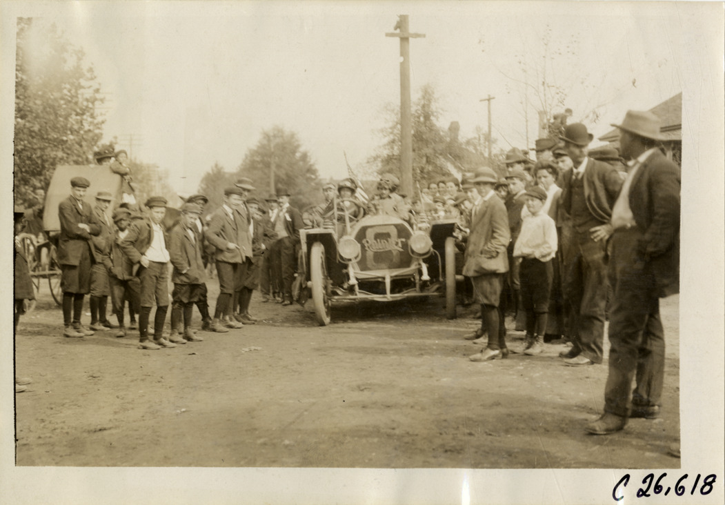 View of Joan Cuneo and motorists in Rainier press car, surrounded by spectators, during the 1909 New York to Atlanta Good Roads Tour. Stamped on back: "Spooner & Wells, Inc., photographers, telephones 3472-3473 Columbus, 1931 Broadway, New York." Handwritten on back: "Tours--New York-Atlanta Good Roads Tour, 1909."