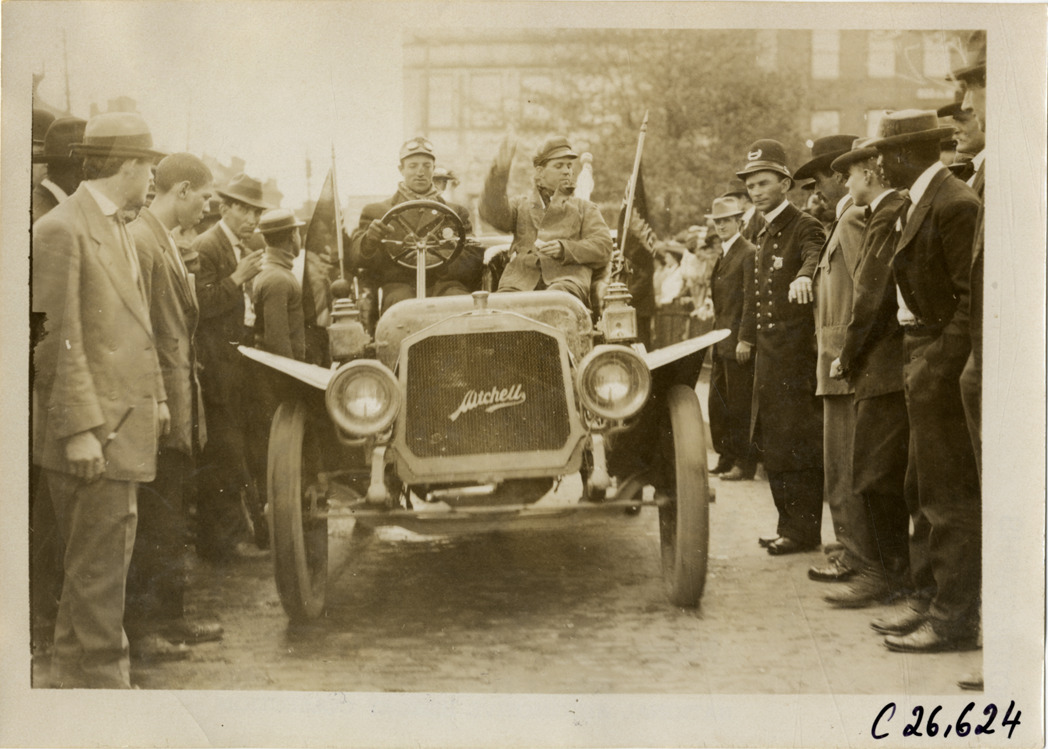 View of motorists in Mitchell pacemaker car, surrounded by spectators and policeman, during the 1909 New York to Atlanta Good Roads Tour. Stamped on back: "Spooner & Wells, Inc., photographers, telephones 3472-3473 Columbus, 1931 Broadway, New York." Handwritten on back: "Tours--New York-Atlanta Good Roads Tour, 1909."