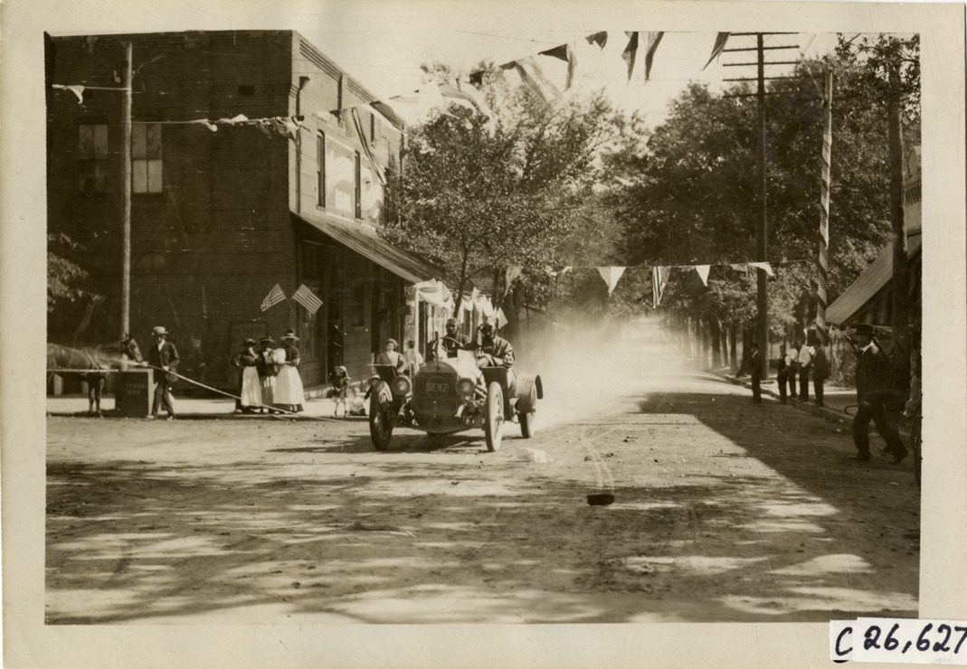 View of motorists in Benz car at Decatur, Georgia during the 1909 New York to Atlanta Good Roads Tour. Spectators and commercial buildings in background. Stamped on back: "Photo by Spooner & Wells, Inc. 1931 Broadway, N.Y." Handwritten on back: "Tours--New York-Atlanta Good Roads Tour, 1909."