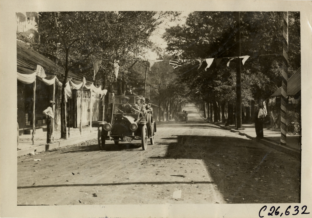 View of motorists in Reo car at Decatur, Georgia during the 1909 New York to Atlanta Good Roads Tour. Pennants are suspended over road; commercial buildings in background. Stamped on back: "Photo by Spooner & Wells, Inc. 1931 Broadway, N.Y." Handwritten on back: "Tours--New York-Atlanta Good Roads Tour, 1909."