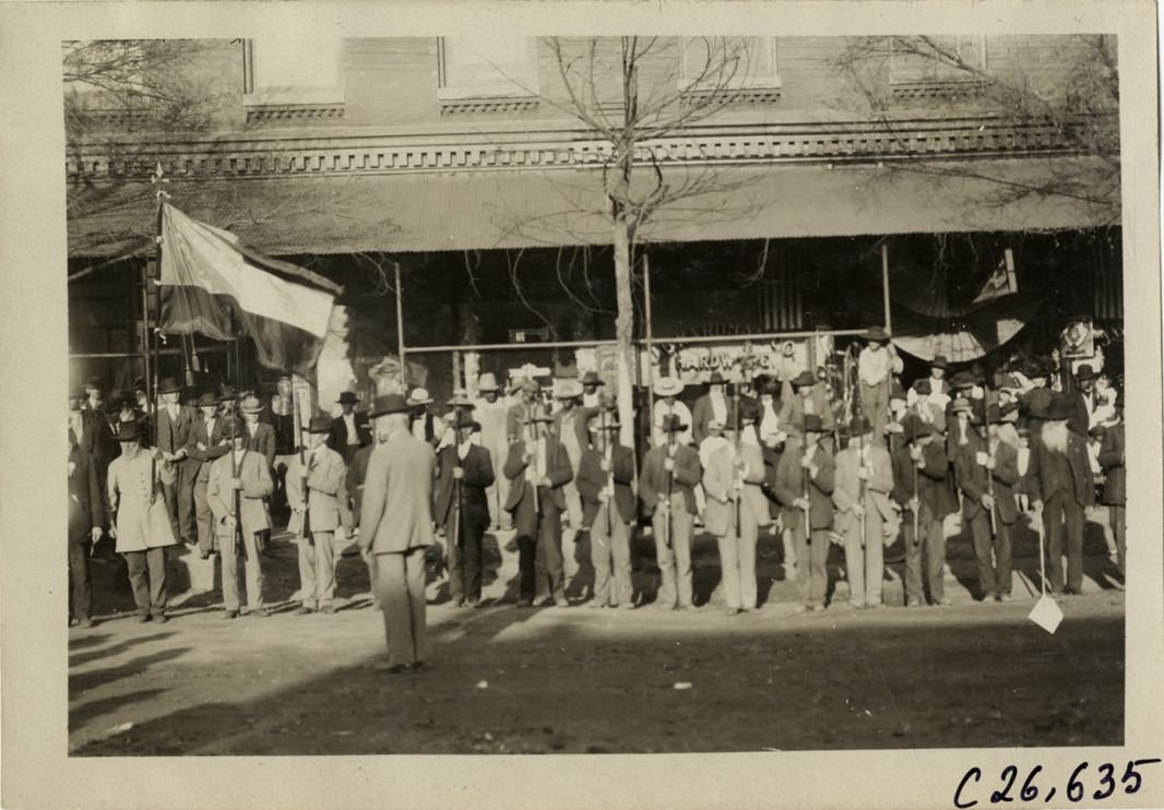 View of group of Confederate veterans at Decatur, Georgia during the 1909 New York to Atlanta Good Roads Tour. Men pose with rifles and flag; hardware store in background. Stamped on back: "Photo by Spooner & Wells, Inc. 1931 Broadway, N.Y." Handwritten on back: "Tours--New York-Atlanta Good Roads Tour, 1909."