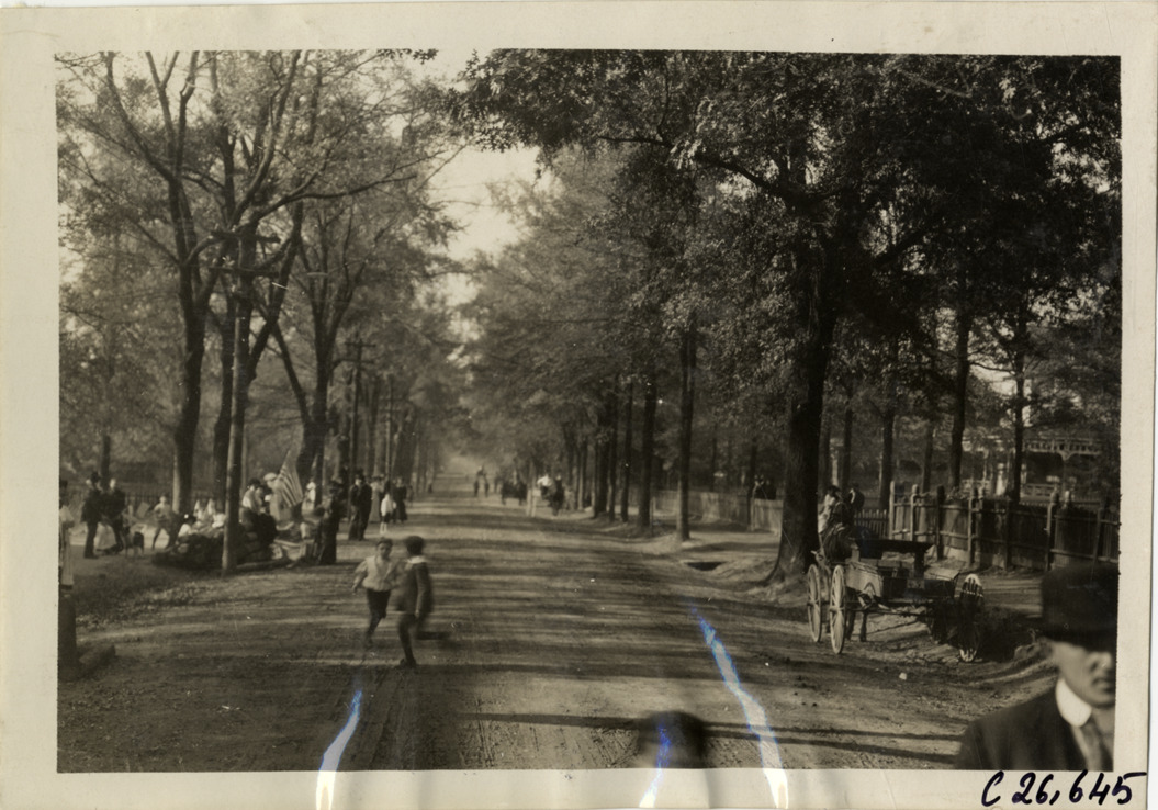 View of spectators waiting along tree-lined dirt road during the 1909 New York to Atlanta Good Roads Tour. Two children play in road; horse-drawn wagon on right. Stamped on back: "Spooner & Wells, Inc., photographers, telephones 3472-3473 Columbus, 1931 Broadway, New York." Handwritten on back: "Tours--New York-Atlanta Good Roads Tour, 1909."