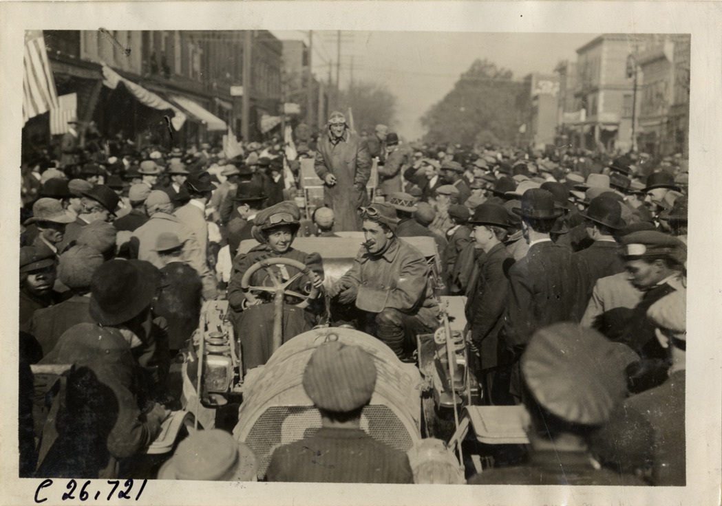 View of Joan Cuneo and passenger in Rainier press car, surrounded by crowd of spectators, during the 1909 New York to Atlanta Good Roads Tour. Stamped on back: "Photo by Spooner & Wells, Inc. 1931 Broadway, N.Y." Handwritten on back: "Tours--New York-Atlanta Good Roads Tour, 1909."