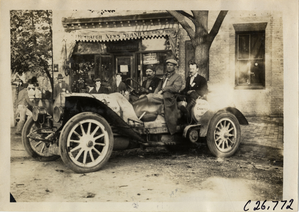 View of motorists posing in Benz car no. 44 during the 1909 New York to Atlanta Good Roads Tour. S.J. Bumbaugh newsstand in background. Handwritten on back: "Tours--New York-Atlanta Good Roads Tour, 1909."