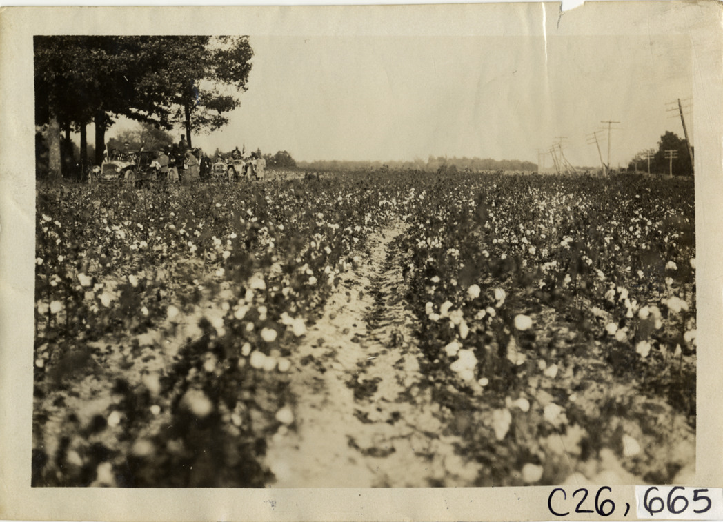 Automobiles parked next to cotton field, 1909 New York-Atlanta Good Roads Tour