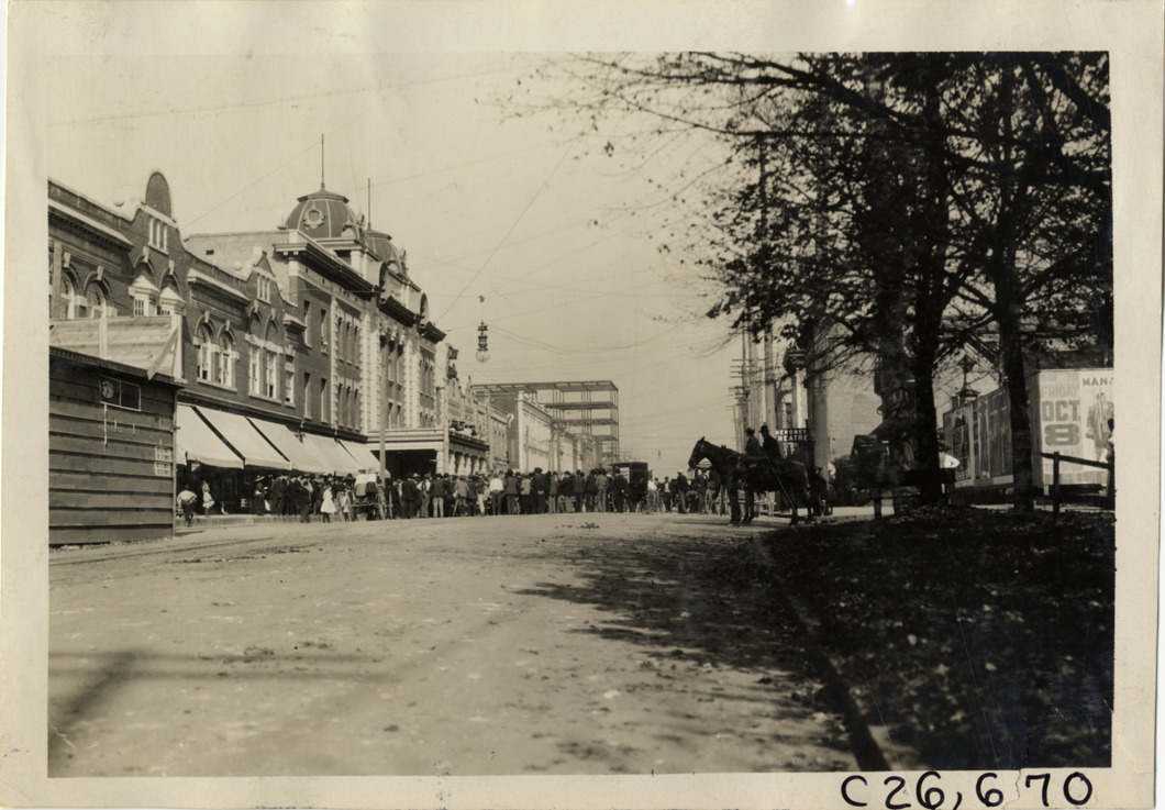 View of crowd of spectators surrounding cars in street at Salisbury, North Carolina during the 1909 New York to Atlanta Good Roads Tour. Men on horses on right; Meroney Theatre in background. Stamped on back: "Photo by Spooner & Wells, Inc. 1931 Broadway, N.Y." Handwritten on back: "Tours--New York-Atlanta Good Roads Tour, 1909."