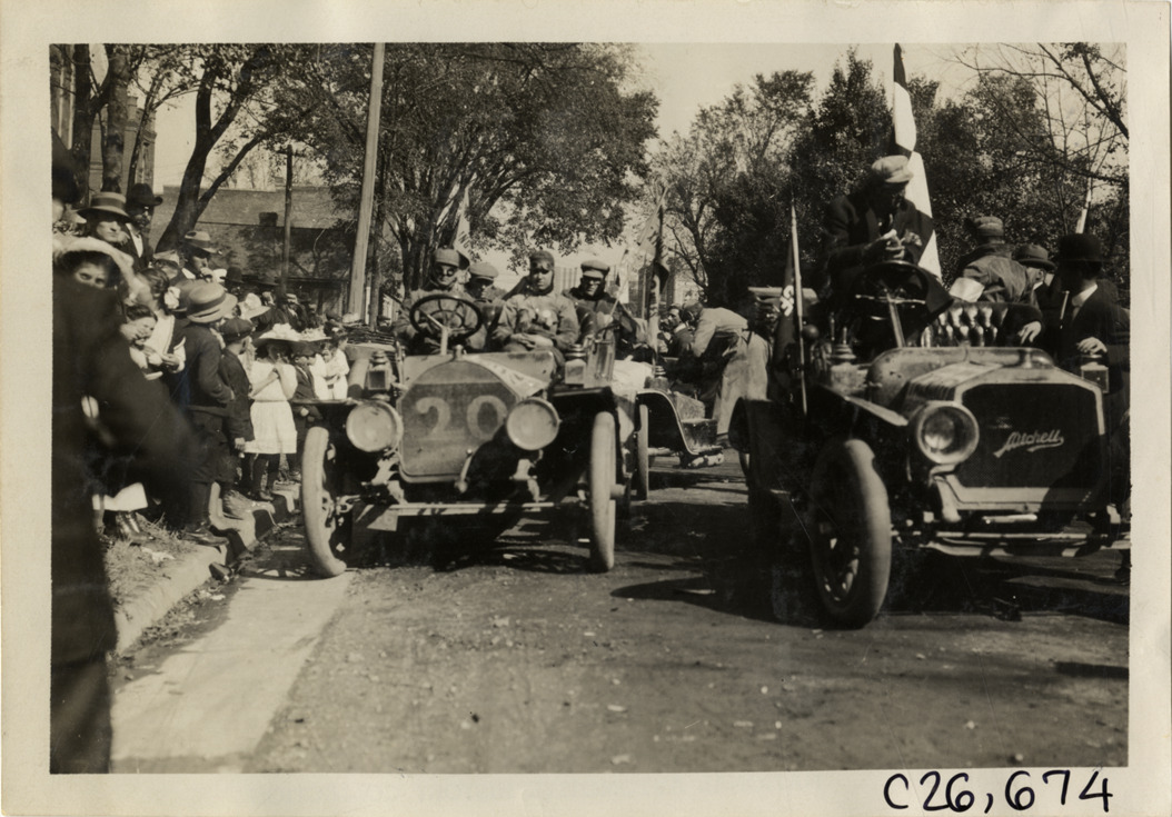 View of motorists in Mitchell pacemaker car and unidentified car during the 1909 New York to Atlanta Good Roads Tour. Stamped on back: "Photo by Spooner & Wells, Inc. 1931 Broadway, N.Y." Handwritten on back: "Tours--New York-Atlanta Good Roads Tour, 1909."