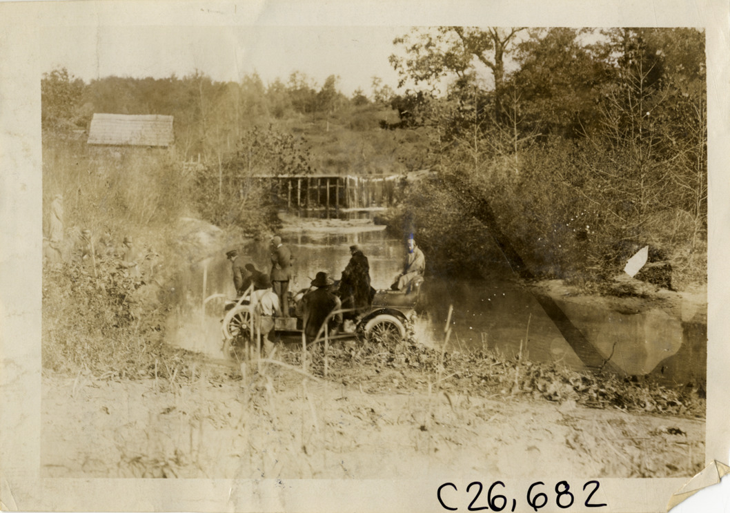 Distant view of motorists in car fording a river during the 1909 New York to Atlanta Good Roads Tour. Stamped on back: "Photo by Spooner & Wells, Inc. 1931 Broadway, N.Y." Handwritten on back: "Tours--New York-Atlanta Good Roads Tour, 1909."