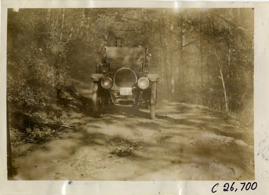 View of motorists in car traveling on forest road during the 1909 New York to Atlanta Good Roads Tour. Stamped on back: "Photo by Spooner & Wells, Inc. 1931 Broadway, N.Y." Handwritten on back: "Tours--New York-Atlanta Good Roads Tour, 1909."