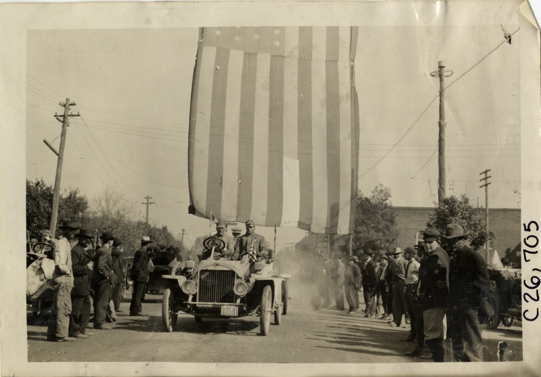 View of motorists posing in White steamer during the 1909 New York to Atlanta Good Roads Tour. Large American flag is suspended over street in background; spectators stand on roadside. Stamped on back: "Photo by Spooner & Wells, Inc. 1931 Broadway, N.Y." Handwritten on back: "Tours--New York-Atlanta Good Roads Tour, 1909."
