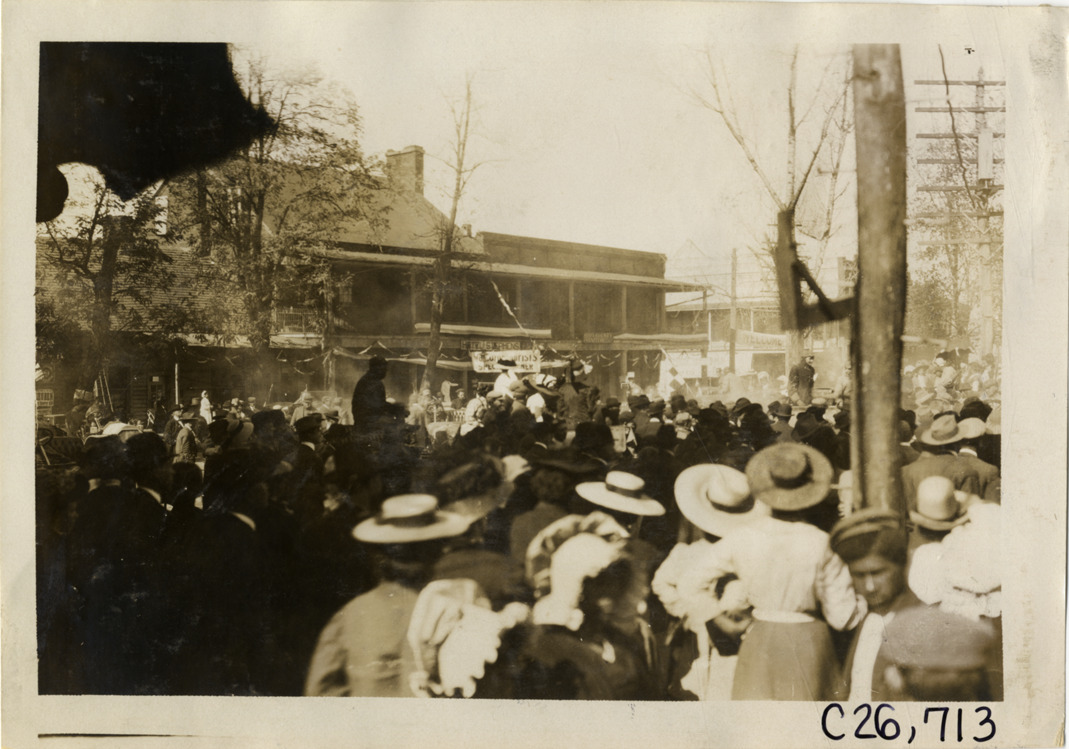 Crowd of spectators in street, 1909 New York-Atlanta Good Roads Tour
