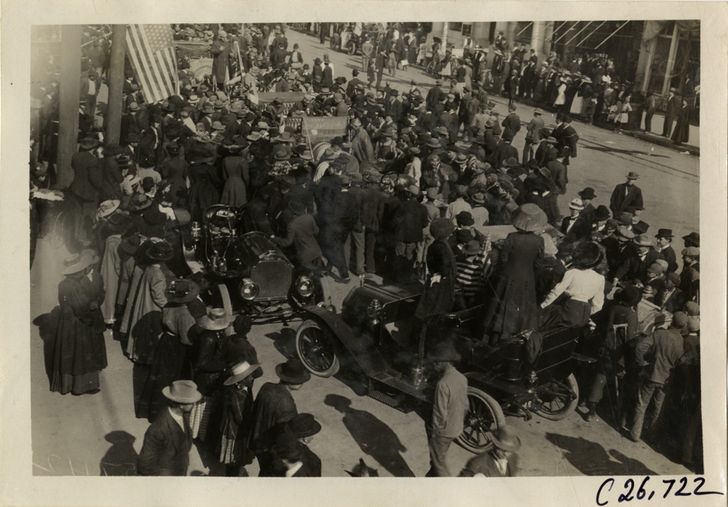 View of crowd of spectators surrounding cars in street at High Point, North Carolina during the 1909 New York to Atlanta Good Roads Tour. Stamped on back: "Photo by Spooner & Wells, Inc. 1931 Broadway, N.Y." Handwritten on back: "Tours--New York-Atlanta Good Roads Tour, 1909."