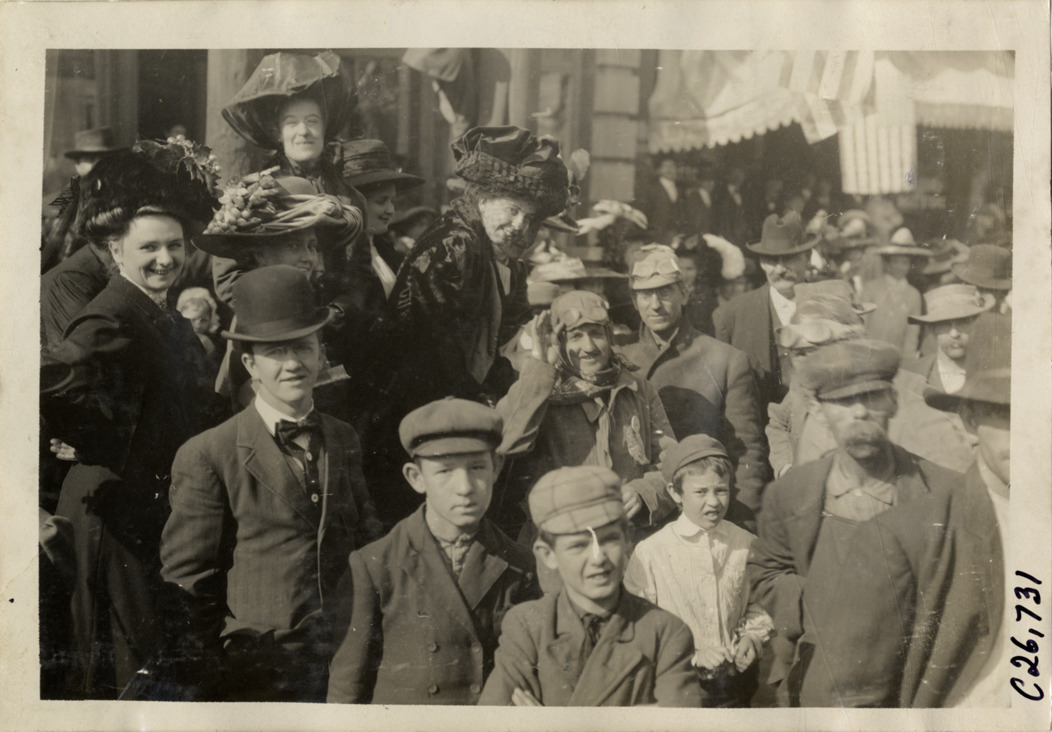 Close-up view of spectators posing with motorists during the 1909 New York to Atlanta Good Roads Tour. Stamped on back: "Photo by Spooner & Wells, Inc. 1931 Broadway, N.Y." Handwritten on back: "Tours--New York-Atlanta Good Roads Tour, 1909."