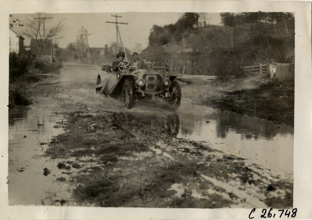 Joan Cuneo and passenger in Rainier press automobile traveling on flooded road, 1909 New York-Atlanta Good Roads Tour