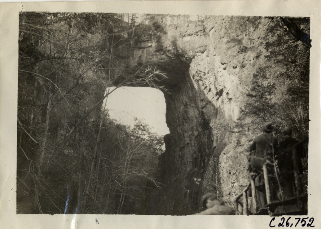 View of rock formation during the 1909 New York to Atlanta Good Roads Tour. Men stand on footbridge in foreground. Stamped on back: "Spooner & Wells, Inc., photographers, telephones 3472-3473 Columbus, 1931 Broadway, New York." Handwritten on back: "Tours--New York-Atlanta Good Roads Tour, 1909."